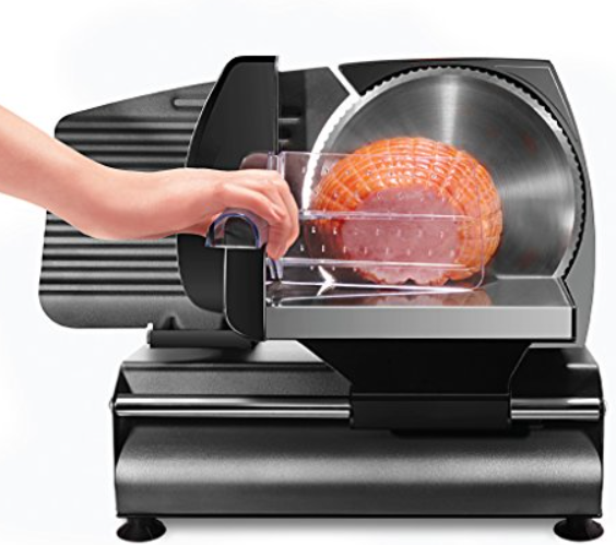 Electric Meat Slicer – These are easy to use and most popular. They do most of the work with a motor moving the carriage. Just place the food and turn it on.